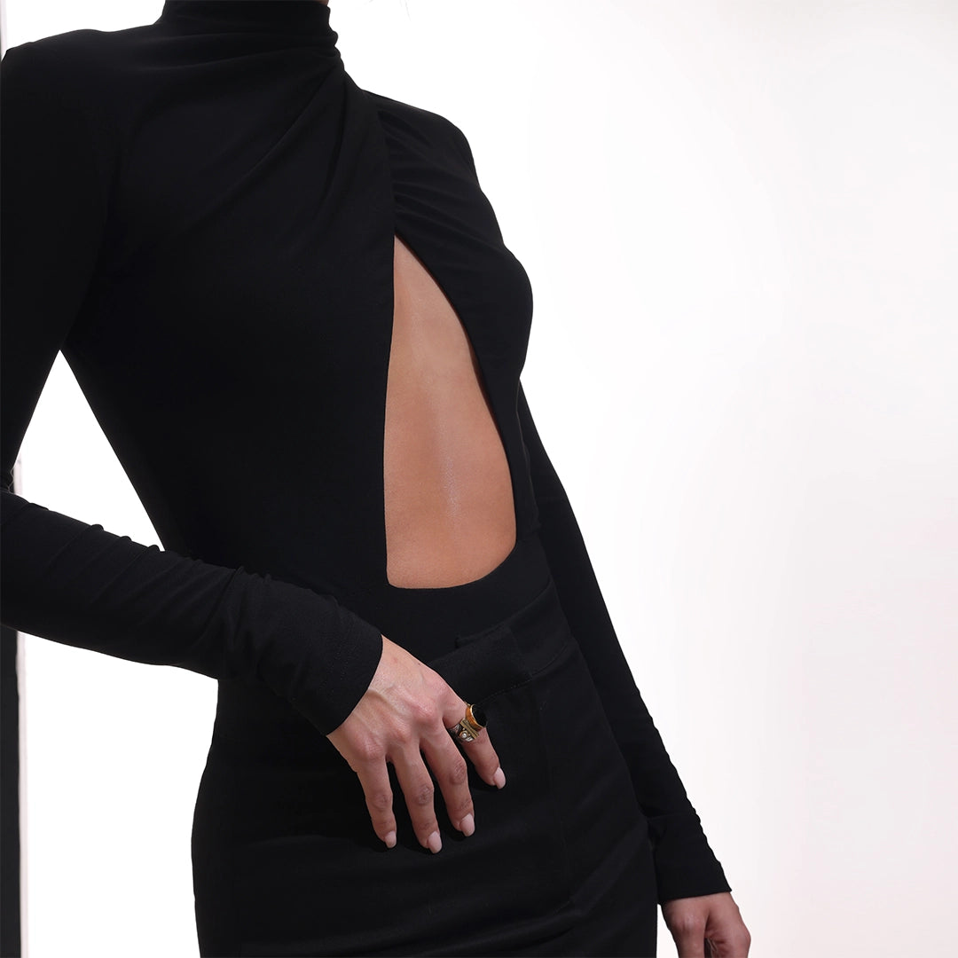 Elegant lycra black bodysuit from form jersey black, featuring a front cut-out, a closed back, andd a draped deisgn that crosses gracefully a the neck!