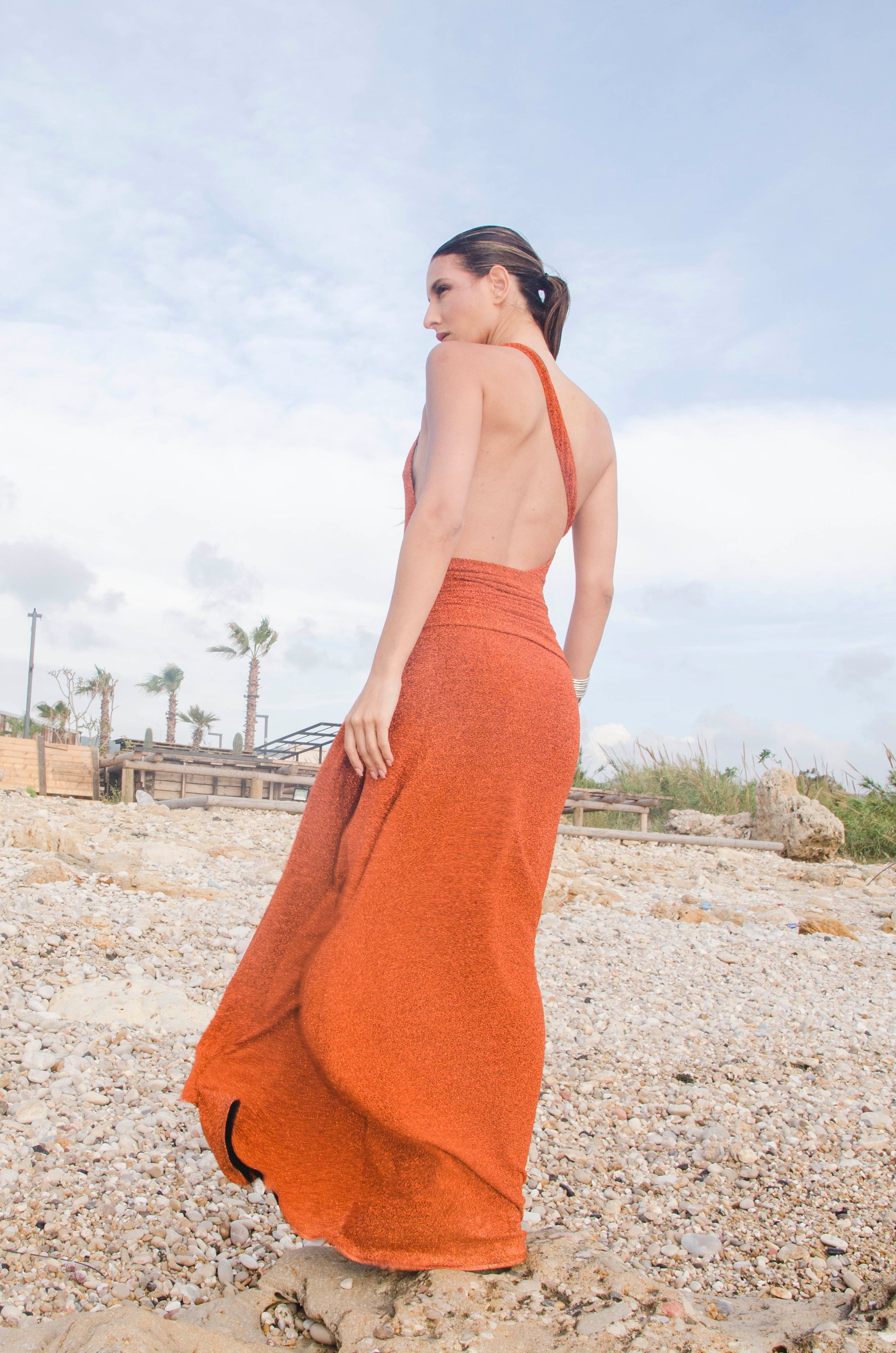 The Amber Dress is a one-shoulder stunner in a rich, fiery hue. Featuring a textured fabric, sculpted fit, and front knot detail, it’s made for seaside sunsets and bold entrances.