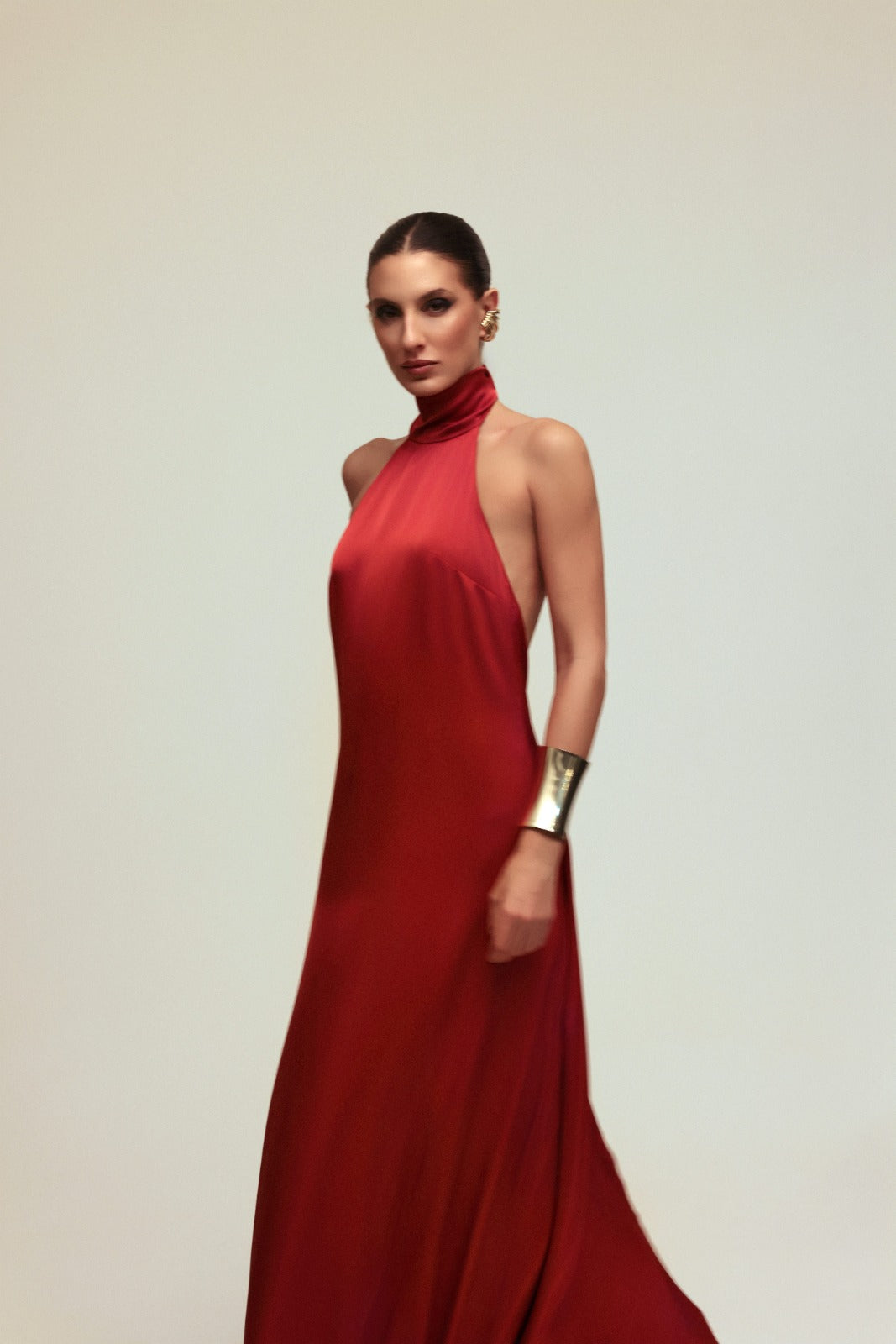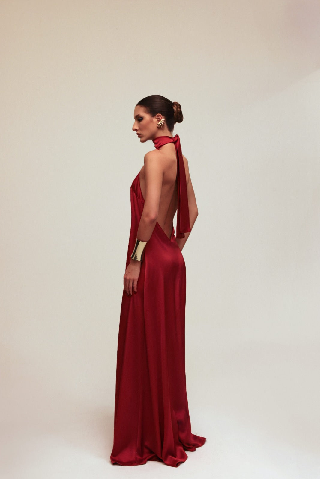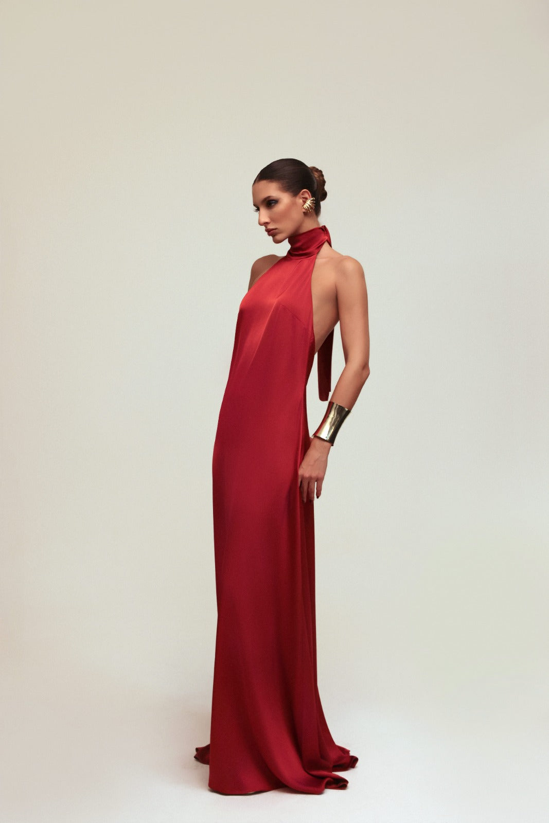 Radiate timeless elegance in the Cherry Vinyl Dress, a fluid floor-length gown that embodies sophistication and allure. Designed in a rich cherry hue, this dress drapes effortlessly over the body, creating a silhouette that moves with grace and confidence.