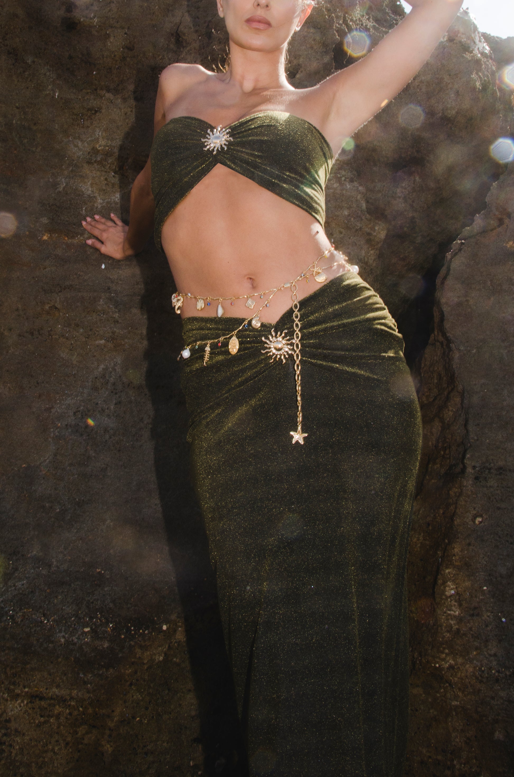 The Euphoria set features a shimmering olive-gold fabric with a sunburst-embellished bandeau top and matching skirt. Daring, radiant, and made to mesmerize under golden light.