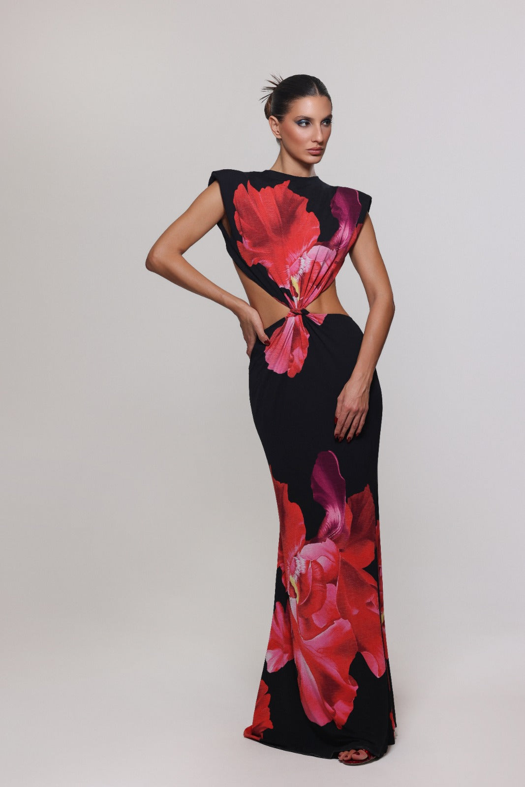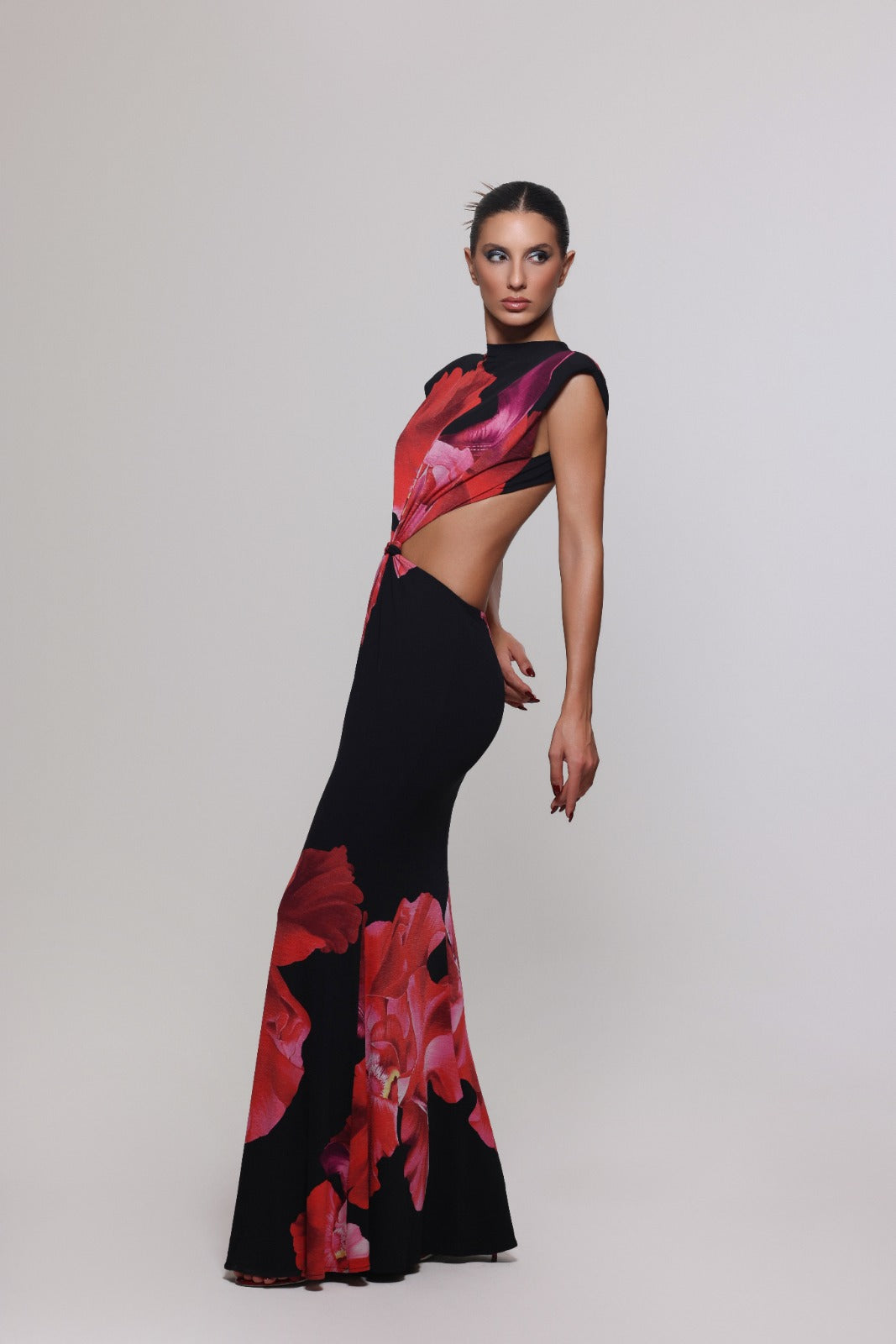 Command attention in the Fatal Bloom gown — a statement of confidence, sensuality, and grace. Crafted in a sleek black fabric adorned with vivid crimson blooms, this piece embodies both strength and allure. Its daring side cutouts and sculpted silhouette celebrate the female form, while the floral artistry adds a touch of romantic drama.