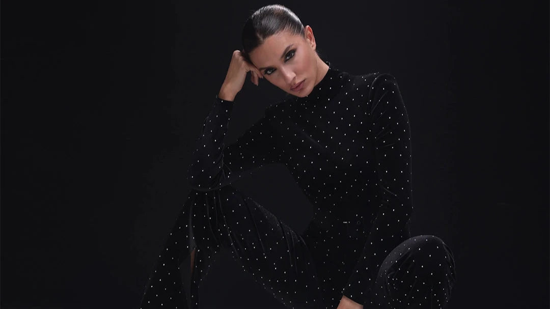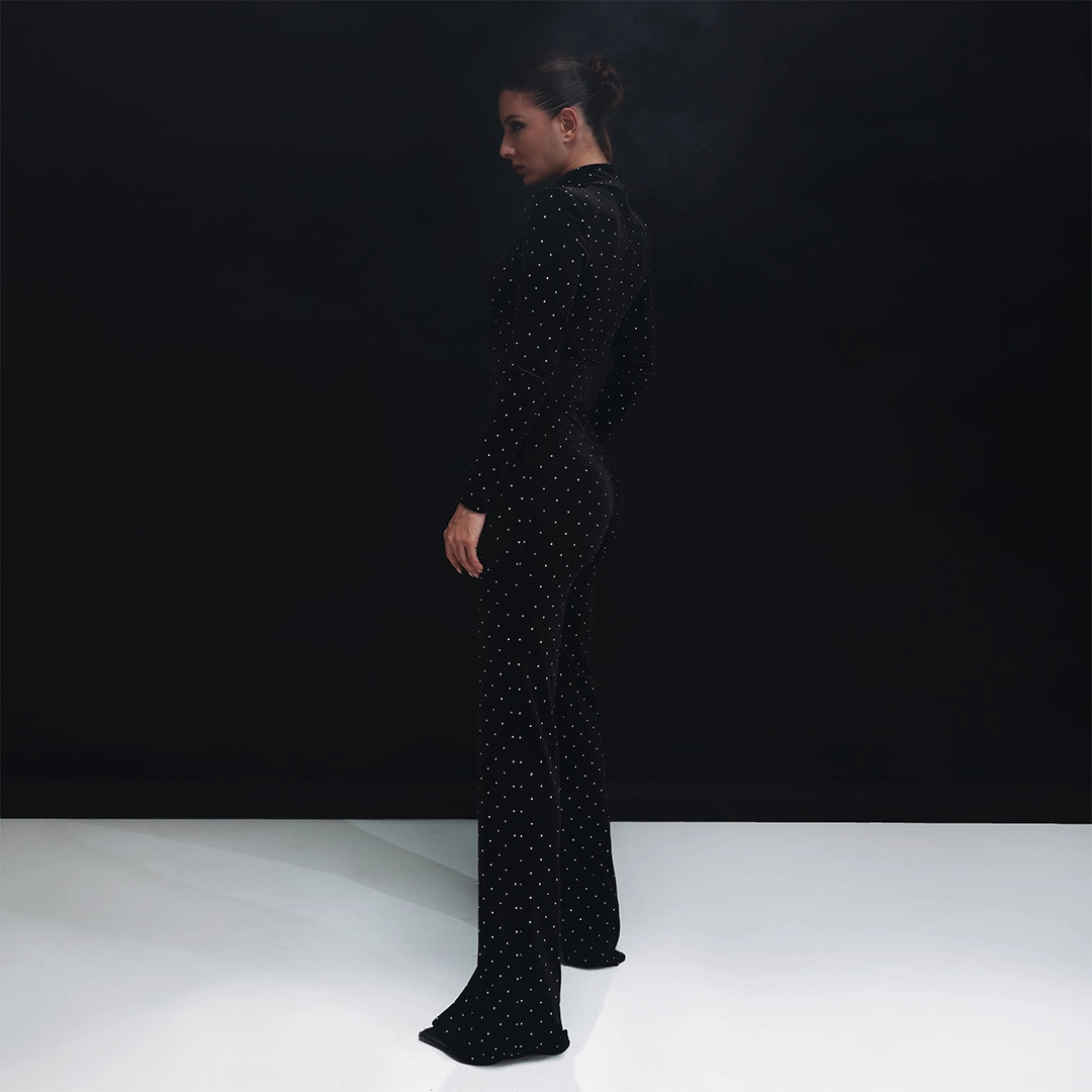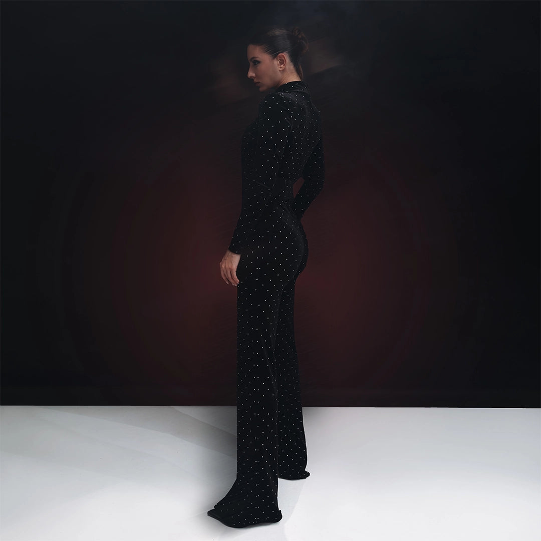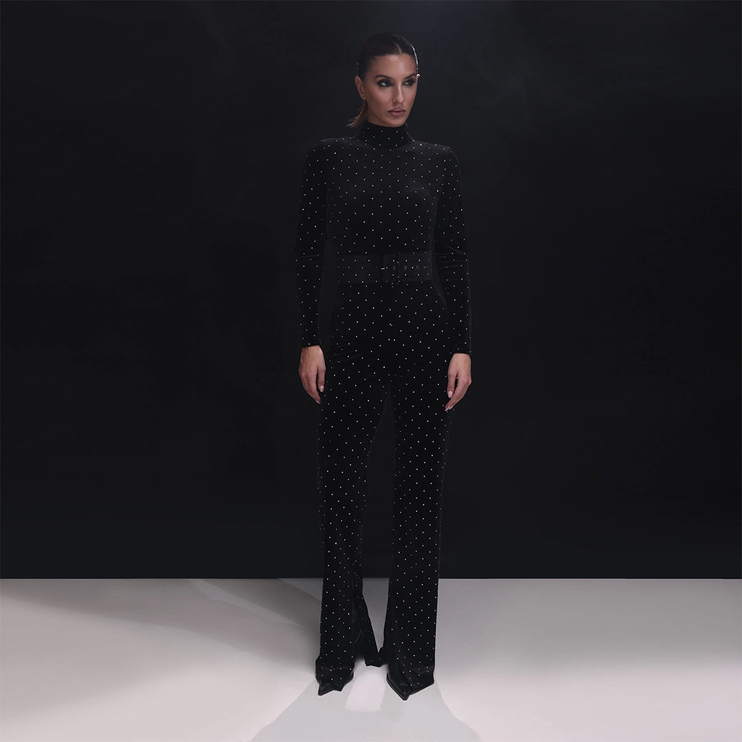 Black suede jumpsuit featuring edgy stud details, a statement thick belt, and sleek slits on the inner legs for a sophisticated look!