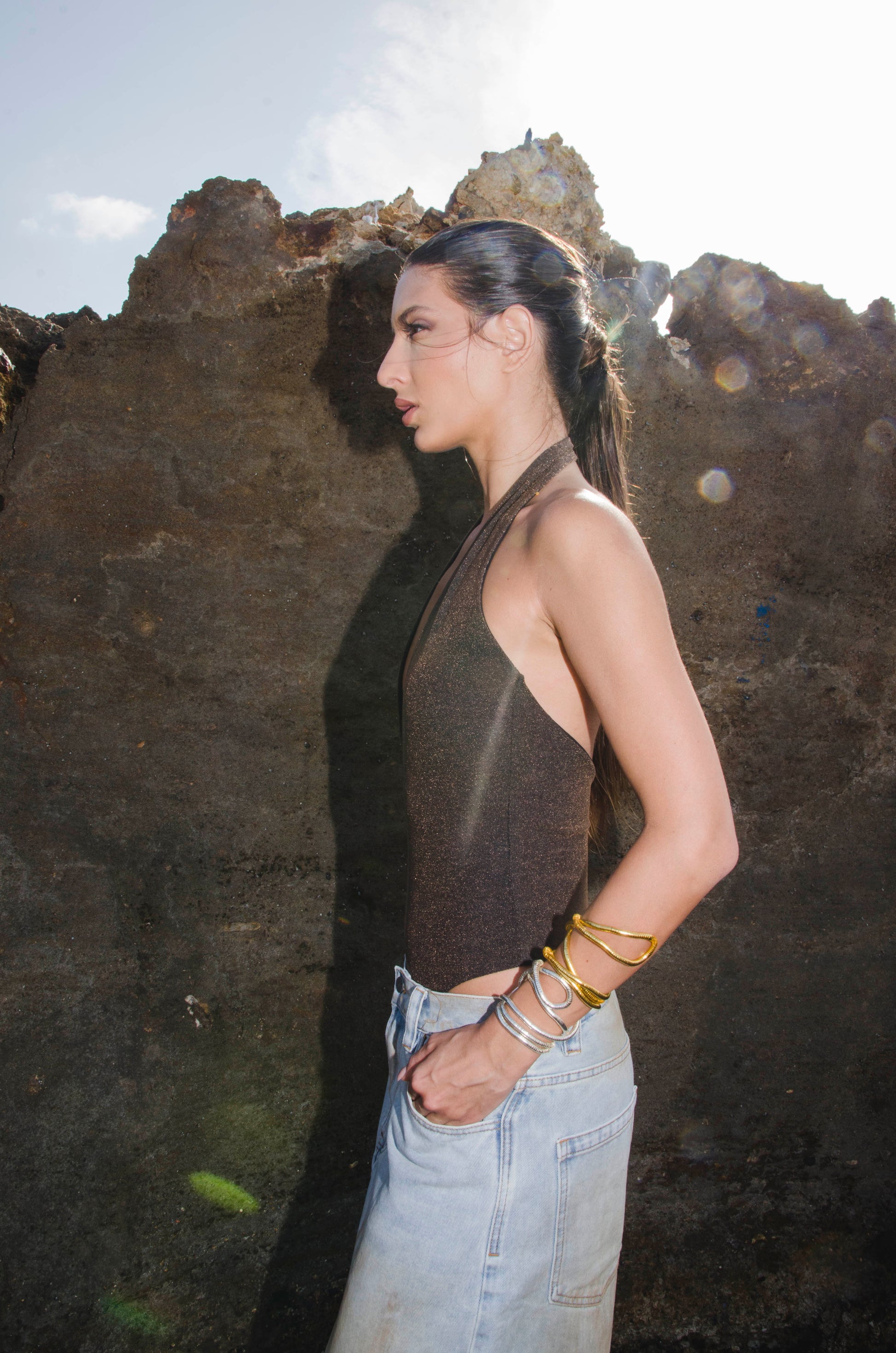 A deep-cut halter bodysuit in shimmering bronze-gold. Stretchy, sculpting, and made to glow with the sunset — perfect for golden hour moments and after-dark plans.