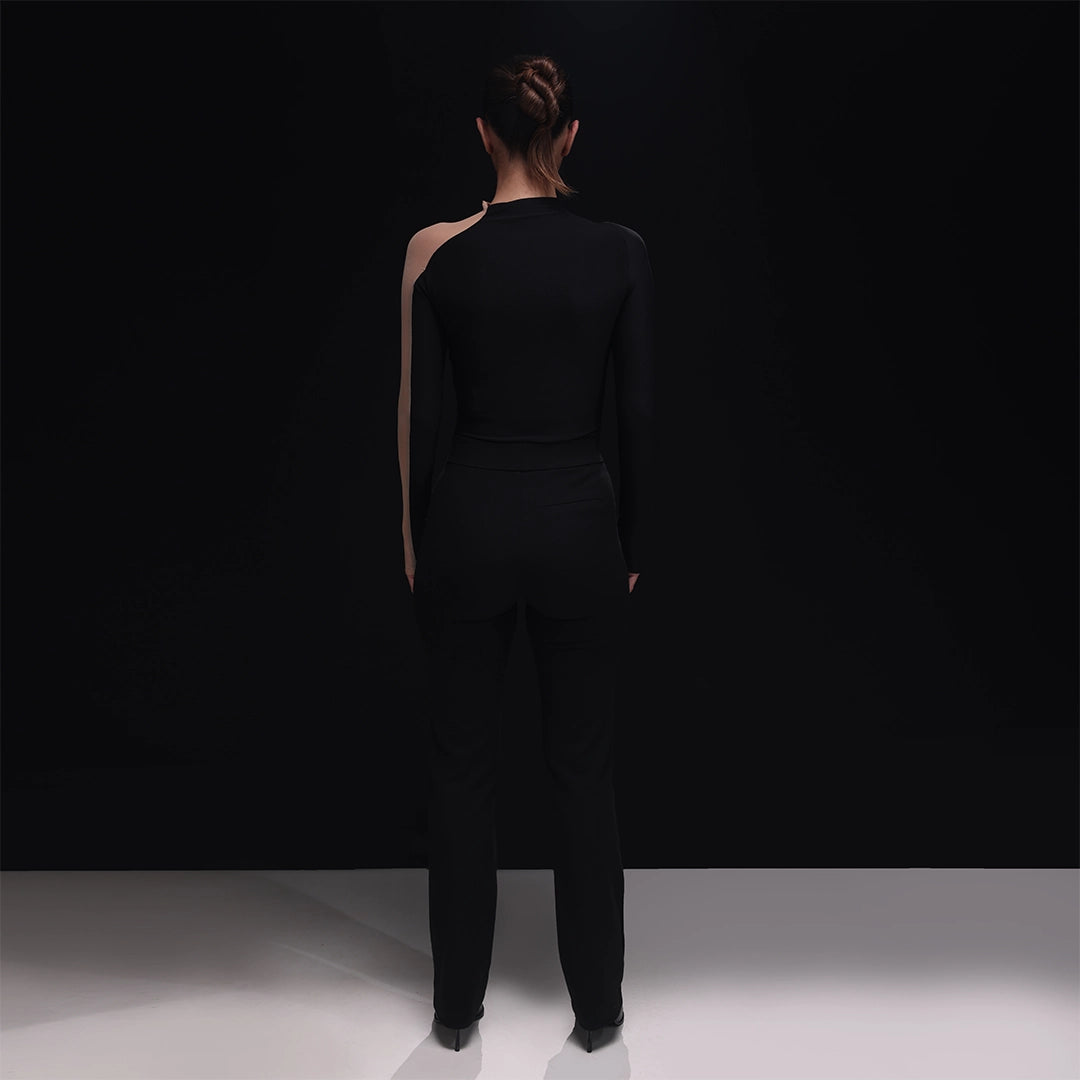 Black pants made of lycra crepe fabric,offering a sleek, stretchy, with slightly matte texture!