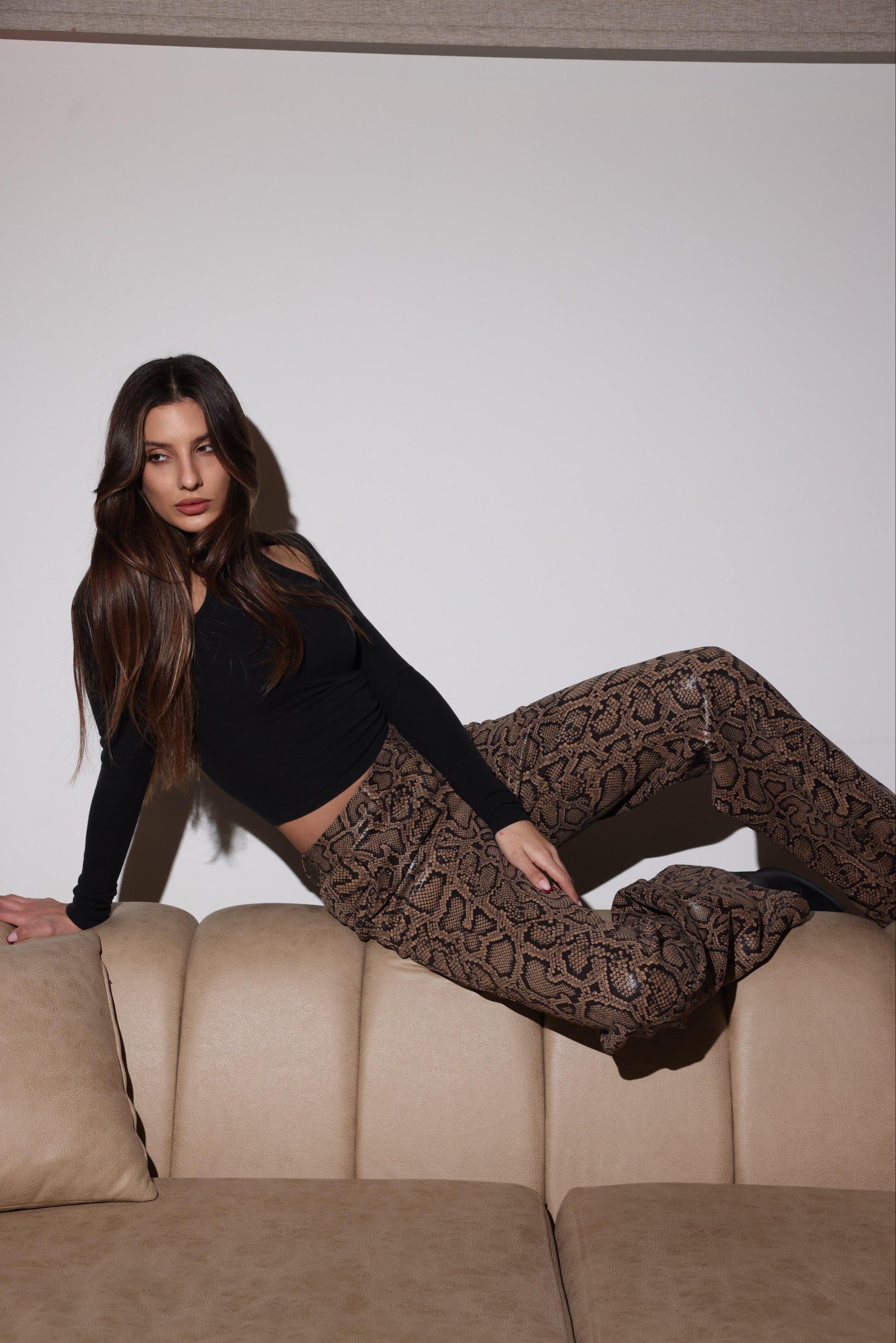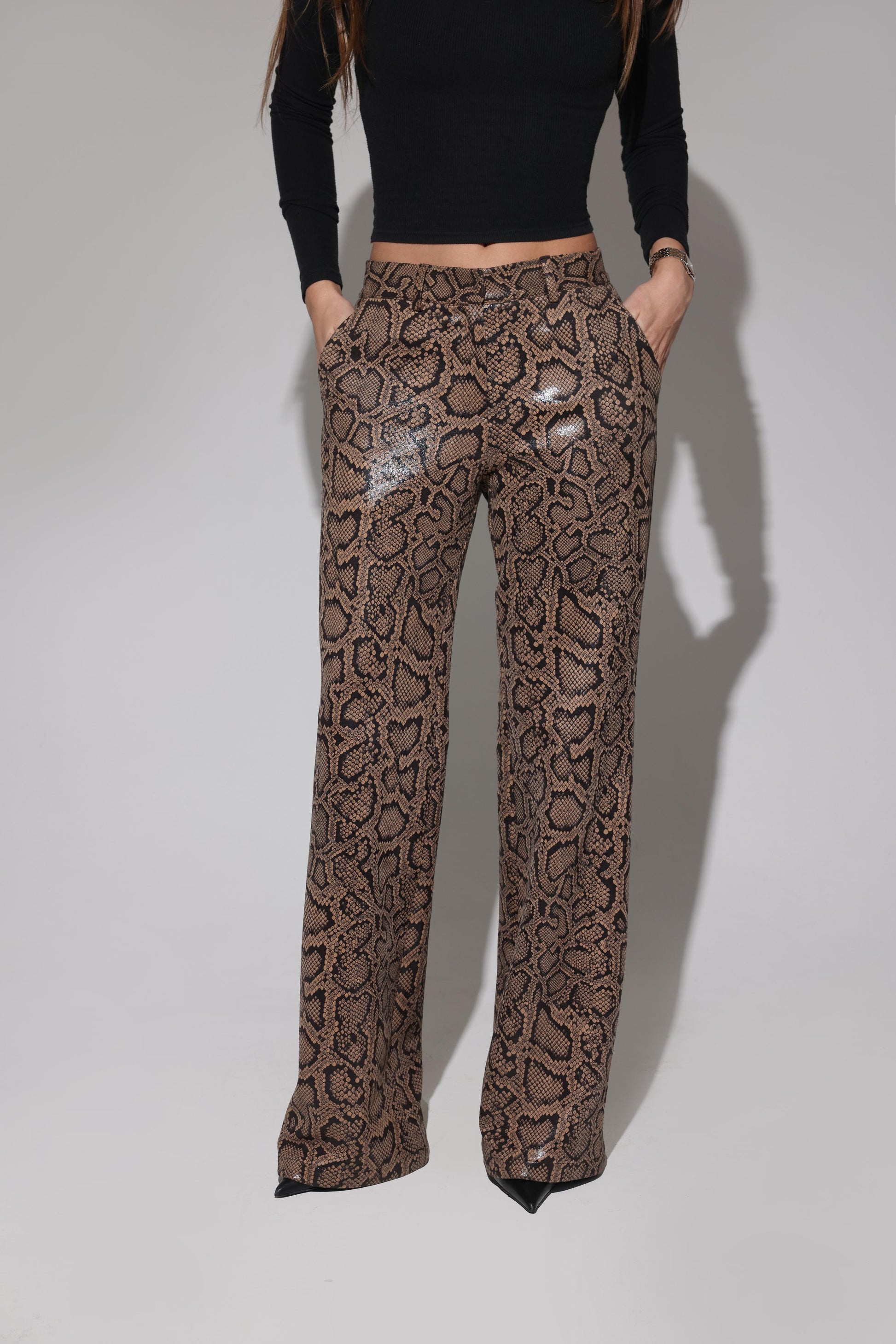 The 'One Kiss' Pants feature a snake faux leather design with a straight cut and a mid-rise fit.
