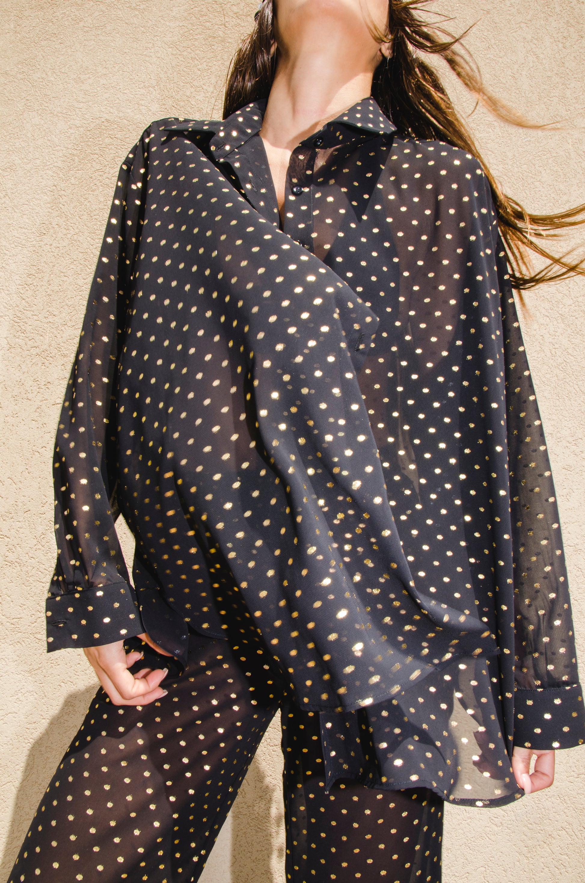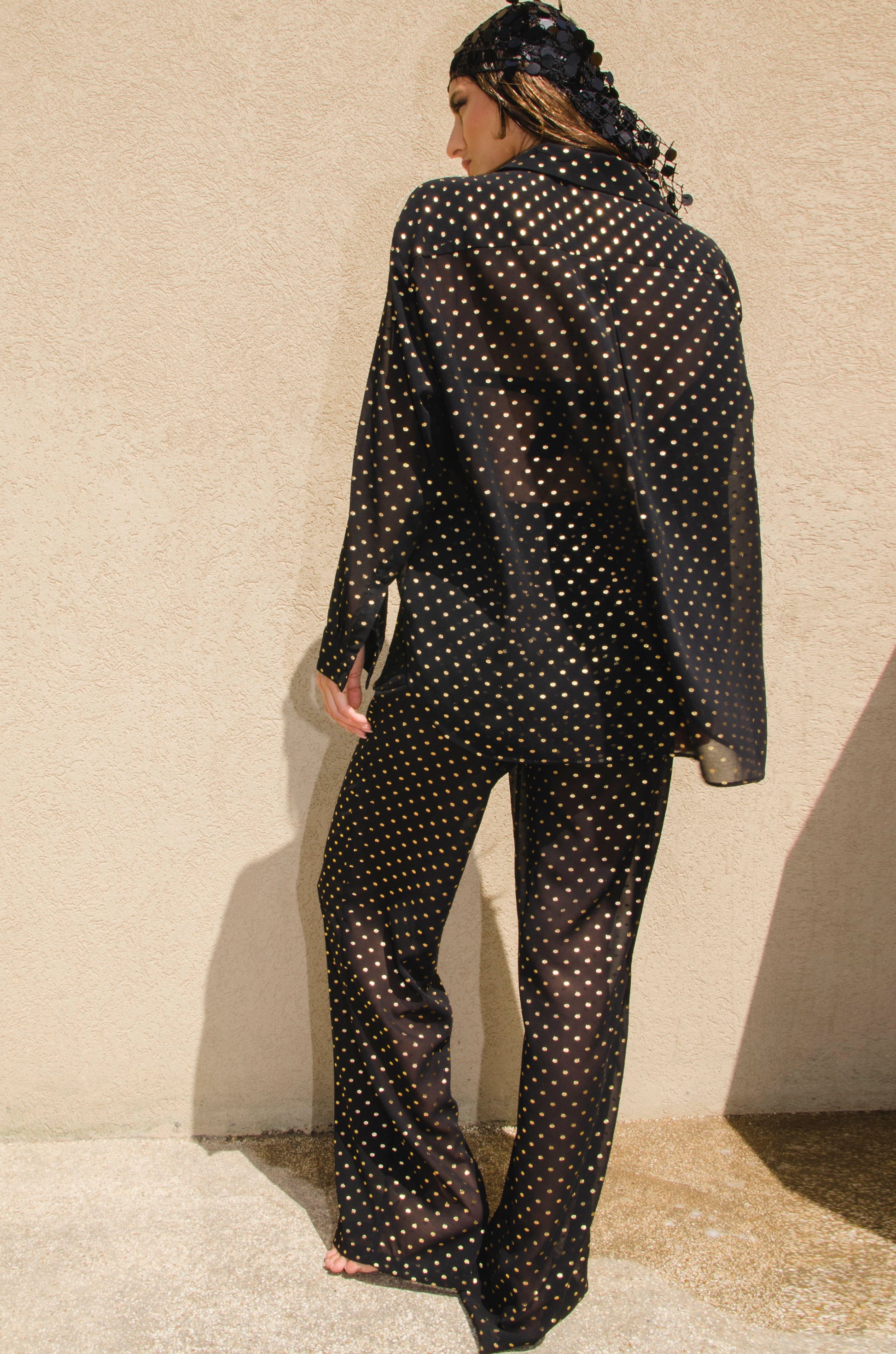 A sheer black set adorned with shimmering gold dots — featuring an oversized button-down top and matching wide-leg pants. Bold, lightweight, and made to glow under the sun or city lights.