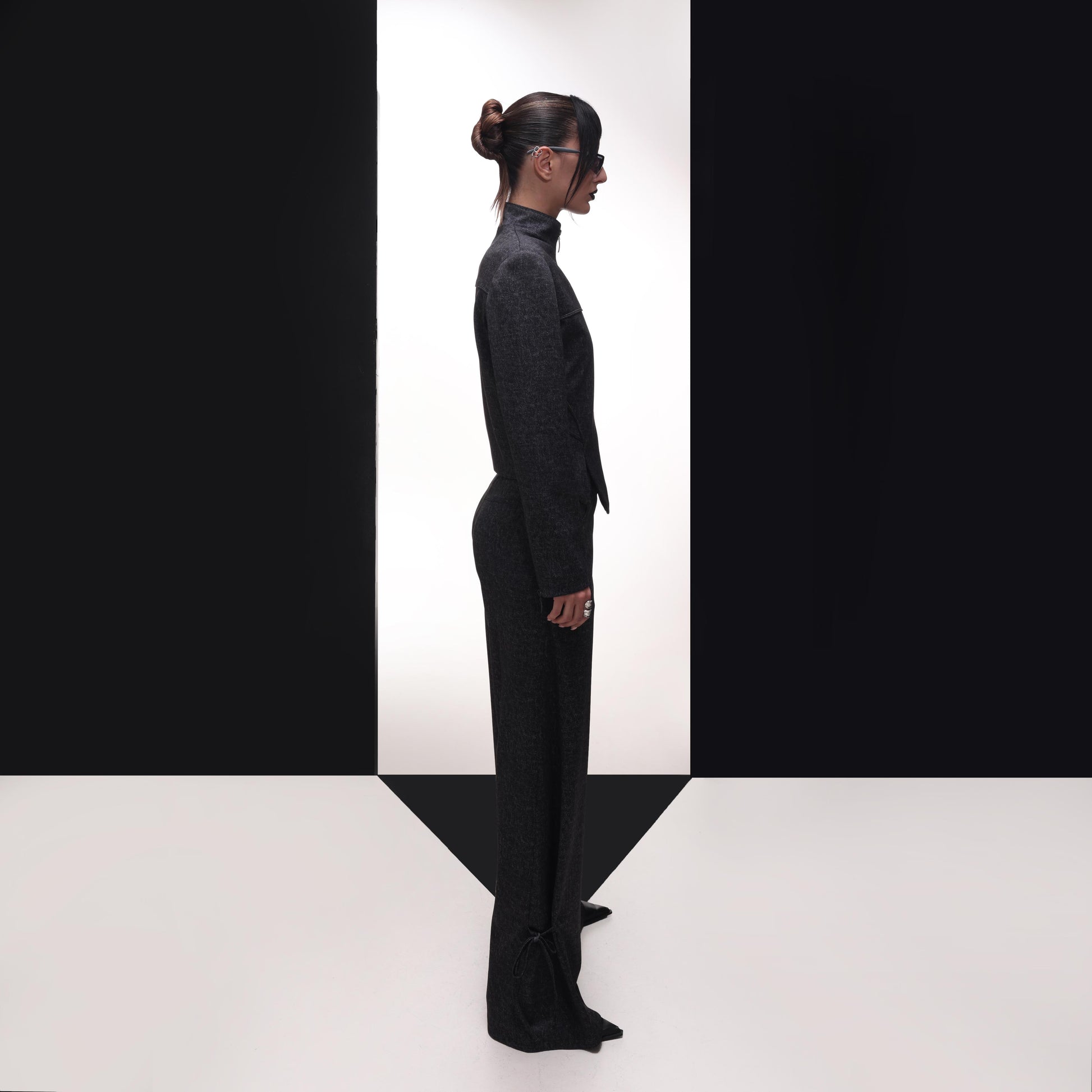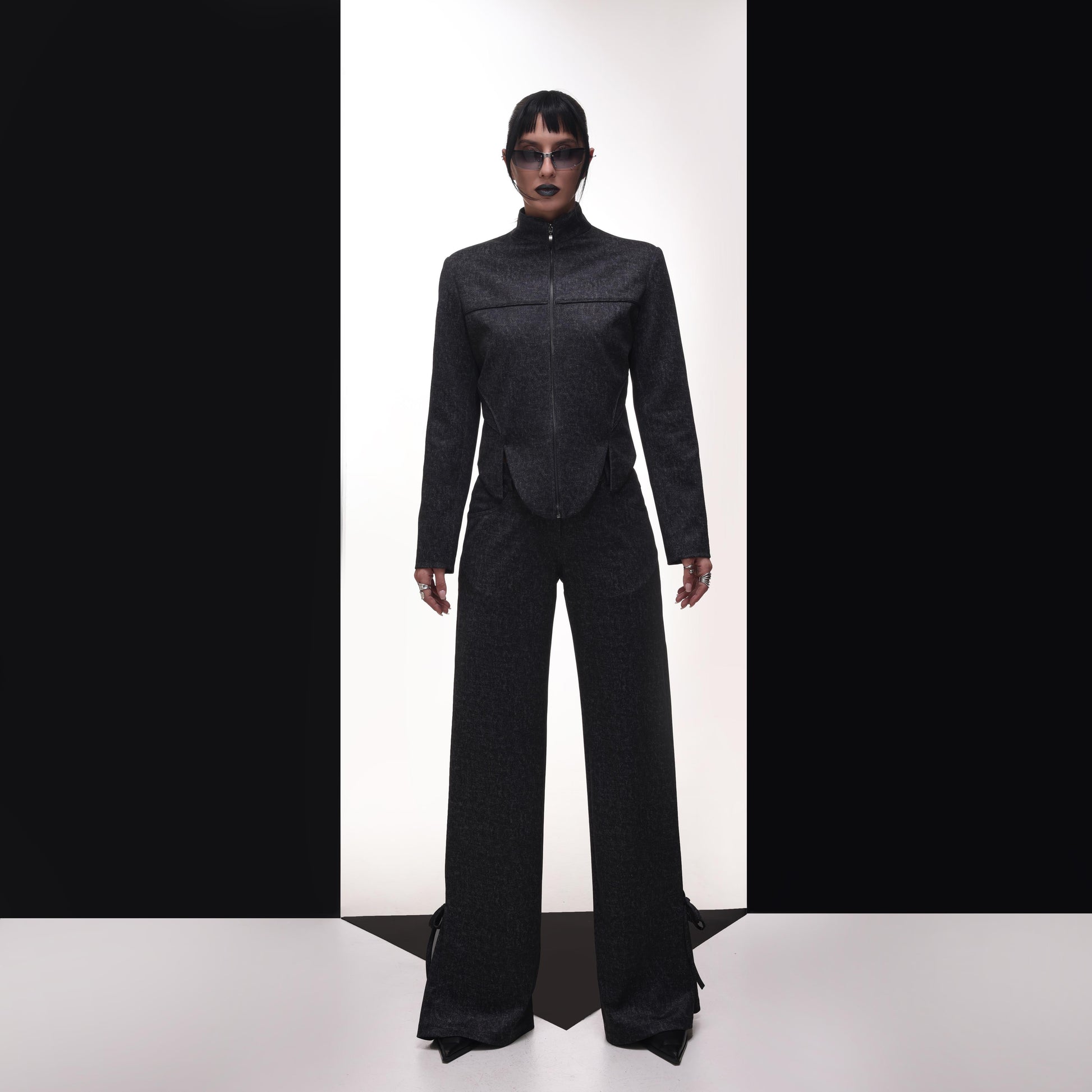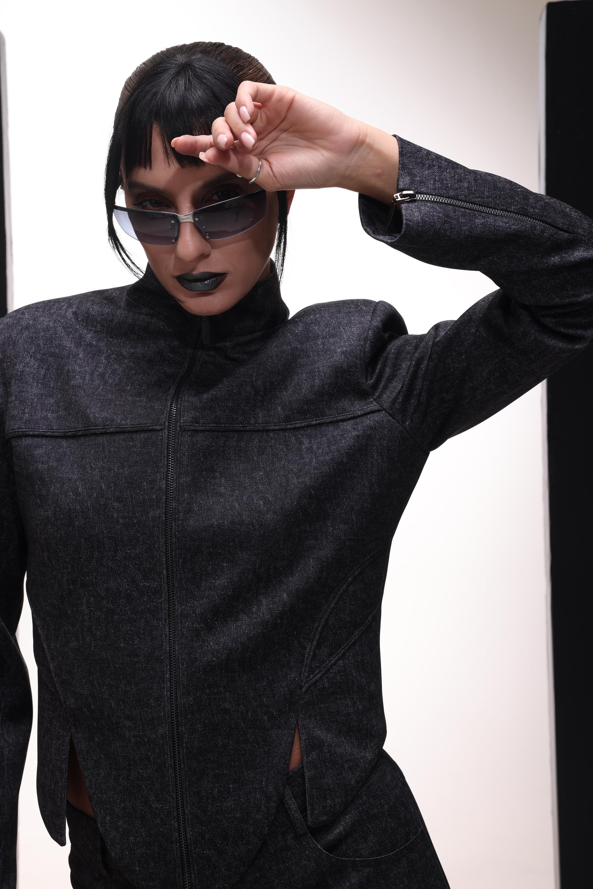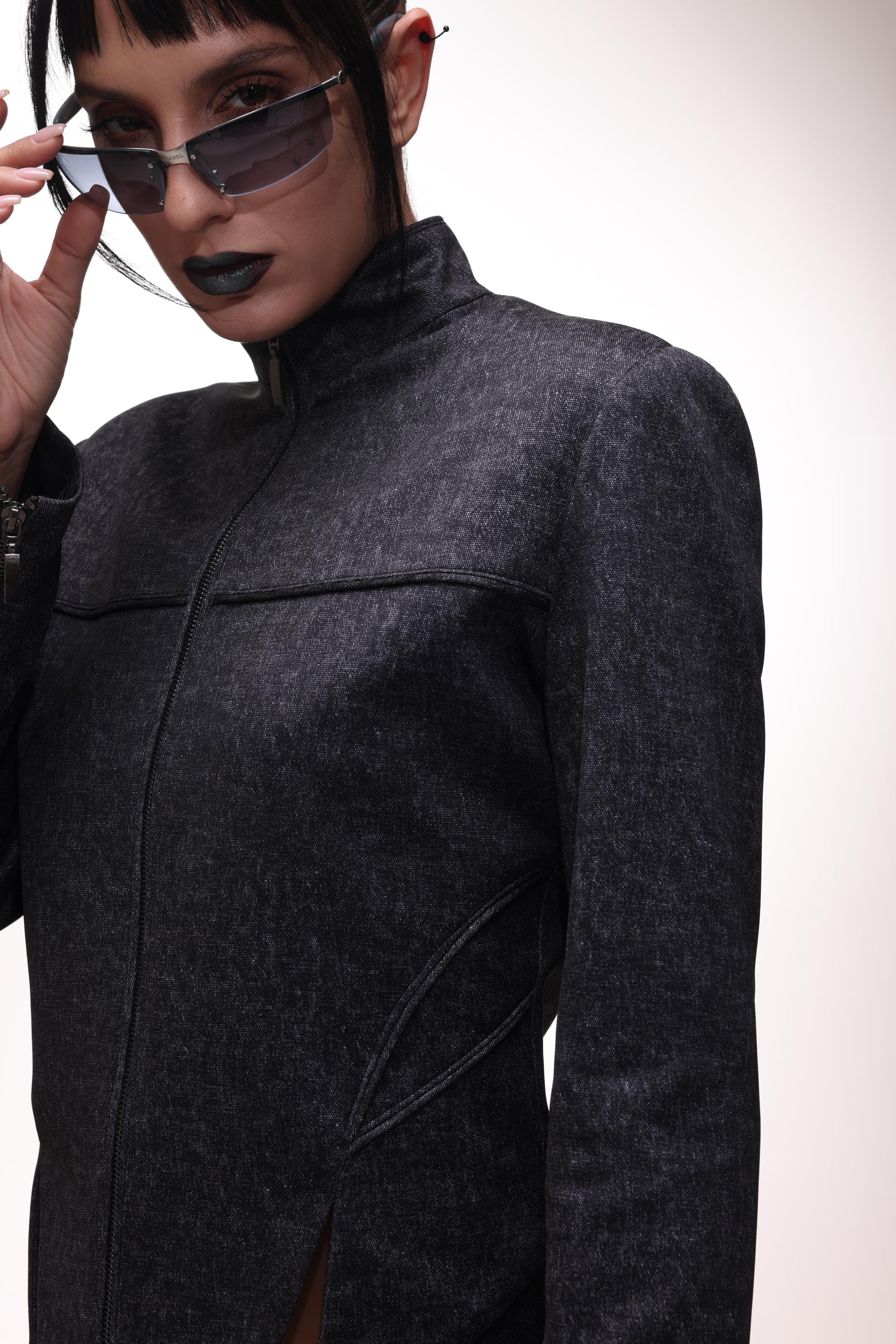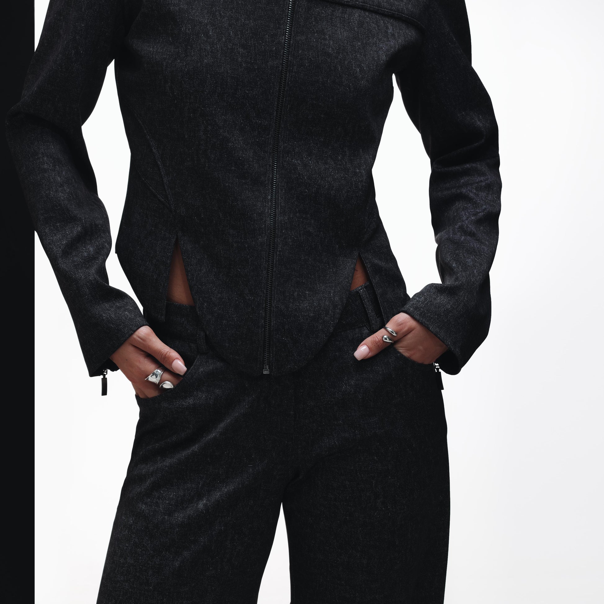 Stylish jacket in thick jersey with a denim look, featuring front zipper closure and bold waist cut-outs for a modern edge!