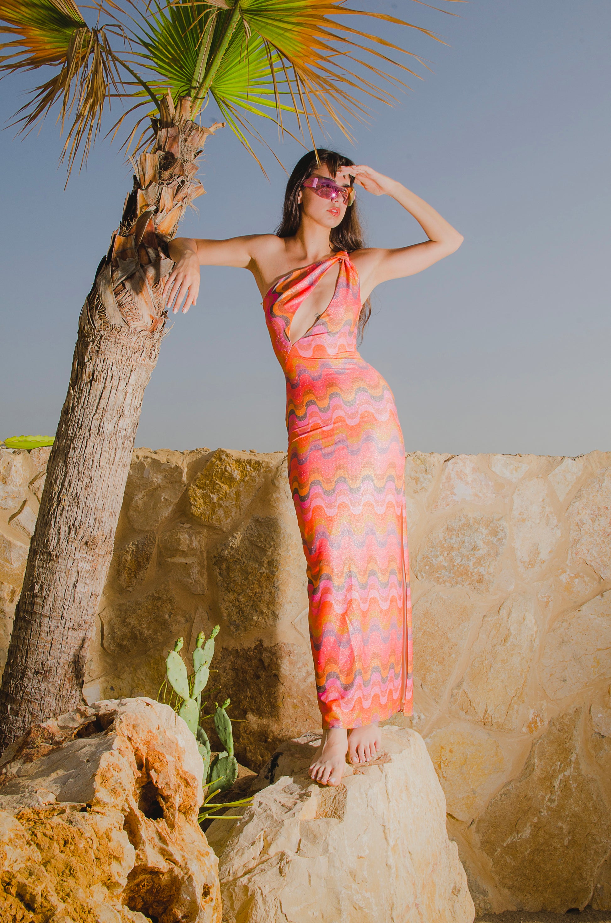 This maxi dress features wave-like patterns and is shiny and multicolored. It has a one-shoulder design with a cutout on the chest area and a side slit, adding a unique touch to its vibrant look. Made of a printed jersey fabric.